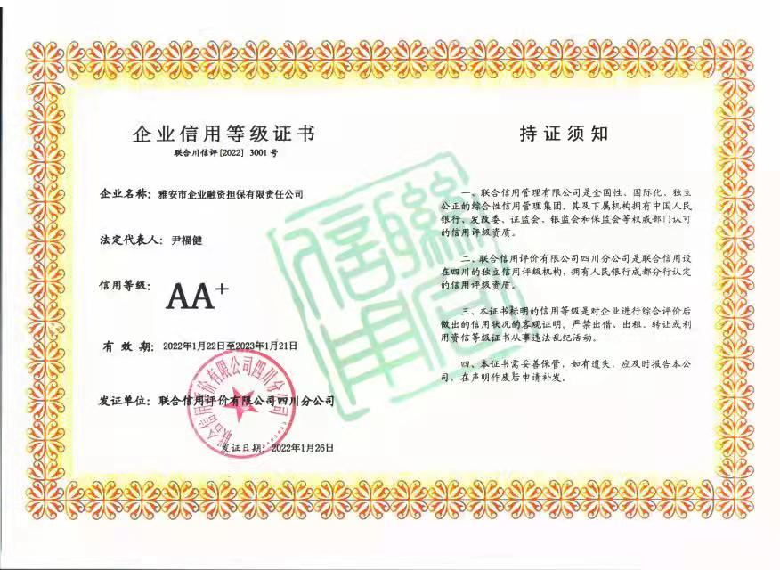 1月28日,從雅安市企業(yè)融資擔(dān)保有限責(zé)任公司(以下簡(jiǎn)稱“市擔(dān)保公司”)傳來(lái)喜訊,經(jīng)聯(lián)合信用評(píng)價(jià)有限公司通過(guò)對(duì)市擔(dān)保公司的信用狀況進(jìn)行綜合分析和評(píng)估,確定該公司信用等級(jí)為AA+。
