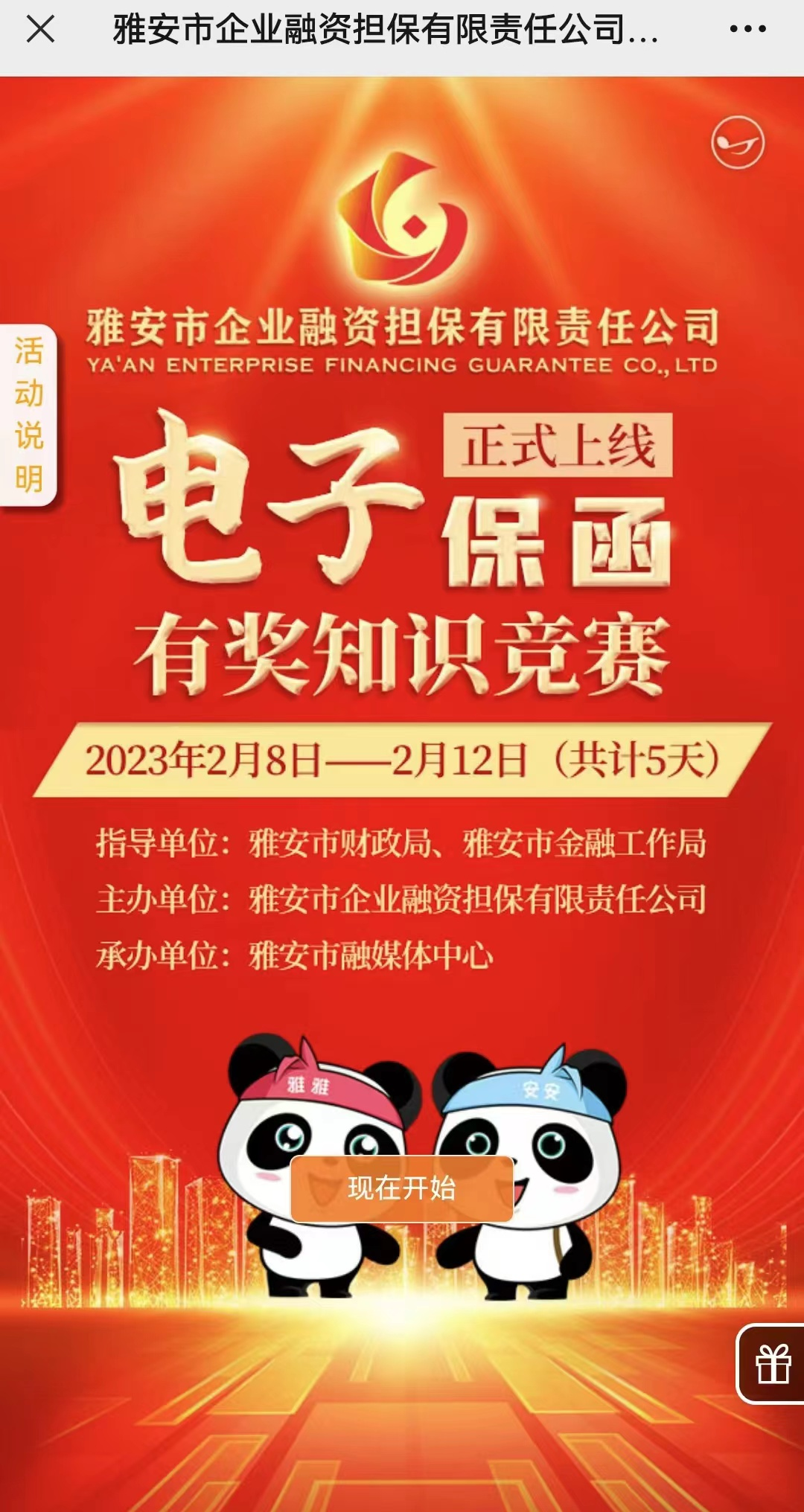 該活動(dòng)由市財(cái)政局和市金融工作局指導(dǎo),雅安市企業(yè)融資擔(dān)保有限責(zé)任公司(以下簡(jiǎn)稱(chēng)“市擔(dān)保公司”)主辦,雅安市融媒體中心承辦。市擔(dān)保公司作為我市唯一一家政府性融資擔(dān)保機(jī)構(gòu),也是雅安公共資源交易中心上線的唯一一家本地全類(lèi)別保函服務(wù)商。2月6日,市擔(dān)保公司“電子投標(biāo)保函”業(yè)務(wù)在雅安公共資源交易中心正式上線。為讓更多的受眾了解“電子投標(biāo)保函”業(yè)務(wù),市擔(dān)保公司主辦了此次線上有獎(jiǎng)知識(shí)競(jìng)賽活動(dòng)。