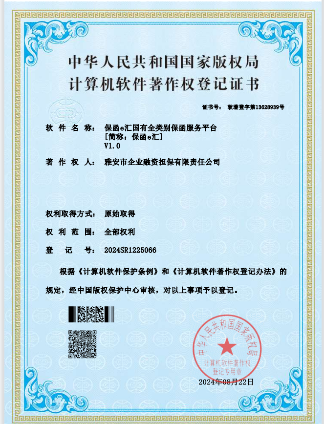 近日,由雅安市擔(dān)保公司開發(fā)完成的《保函e匯國(guó)有全類別保函服務(wù)平臺(tái)(簡(jiǎn)稱:保函e匯)V1.0》軟件通過國(guó)家版權(quán)局的最終審查,獲得由中華人民共和國(guó)版權(quán)局頒發(fā)的計(jì)算機(jī)軟件著作權(quán)登記證書。