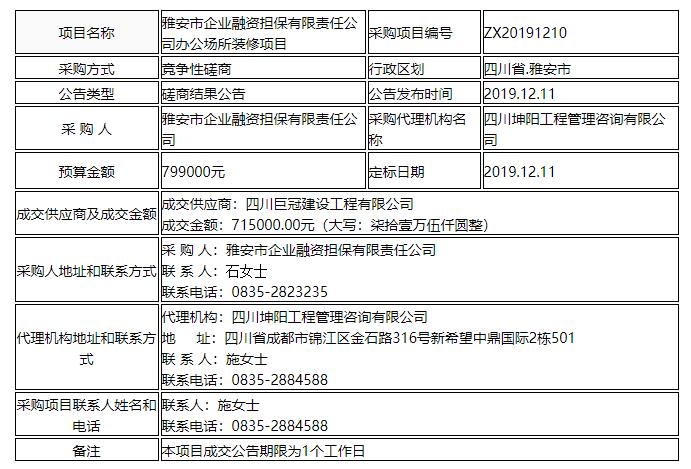雅安市企業(yè)融資擔保有限責任公司辦公場所裝修項目競爭性磋商結果公告