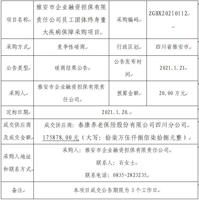 員工團(tuán)體終身重大疾病保障采購項目競爭性磋商結(jié)果公告